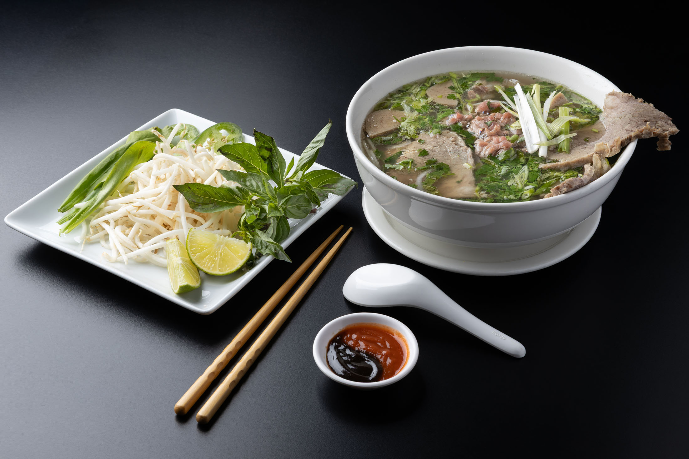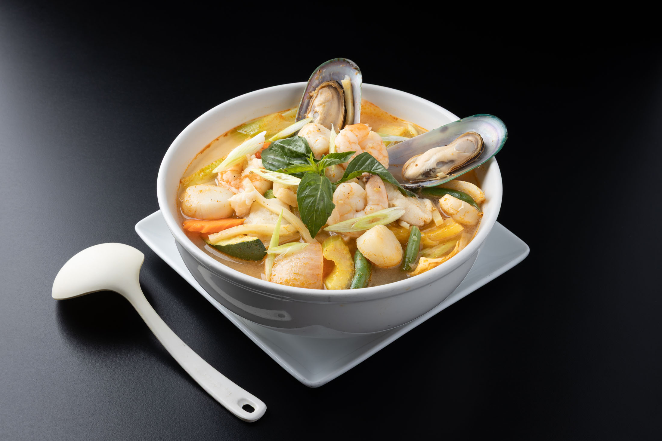 A combination of calamari, white fish, prawns, scallops, mussels, and fresh vegetables in a hot and sour broth. Flavored with lemongrass, lime juice, and kaffir leaves. Topped with fresh basil, green onions, and mushrooms.