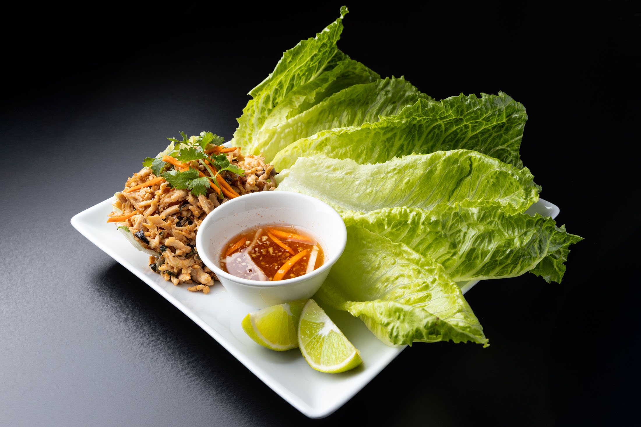 A delightful combination of lean ground chicken or tofu, tossed in fragrant herbs and lime dressing. Served with fresh romaine lettuce.