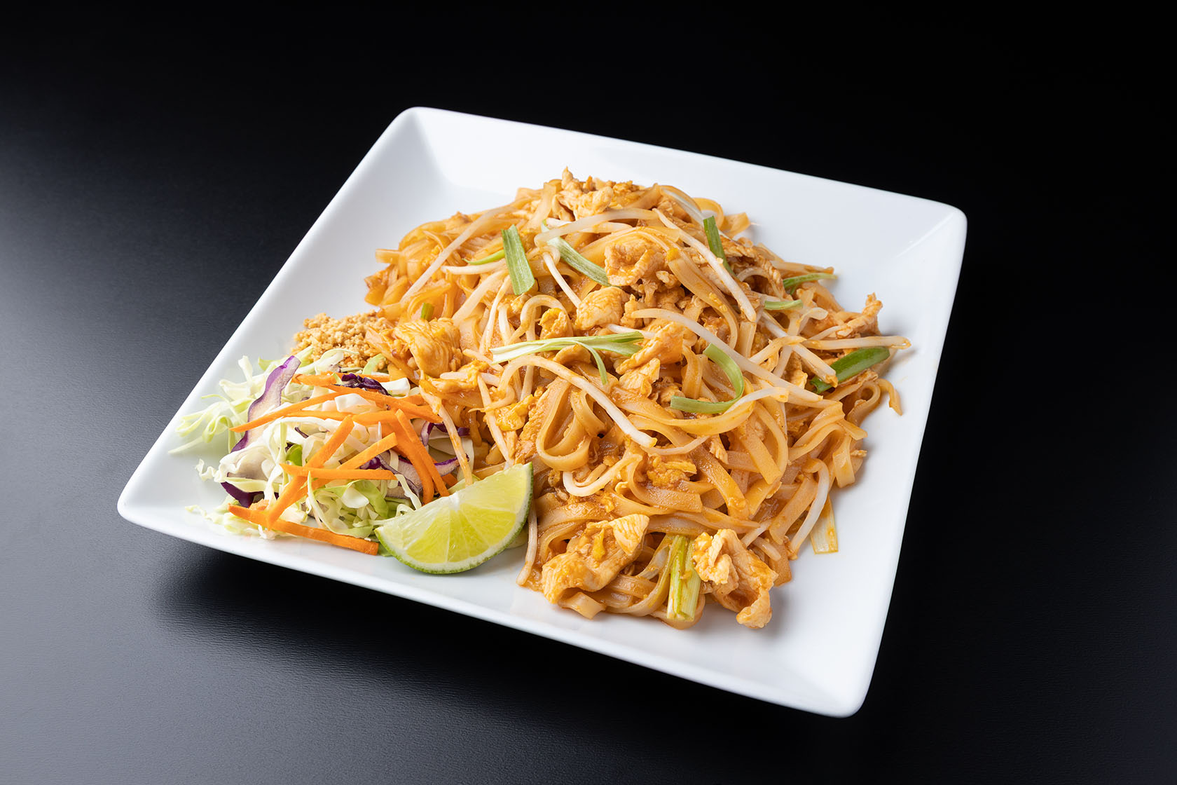 National dish of Thailand: rice noodles, egg, bean sprouts, green onion and crushed peanuts. Your choice of chicken, pork, beef or tofu.