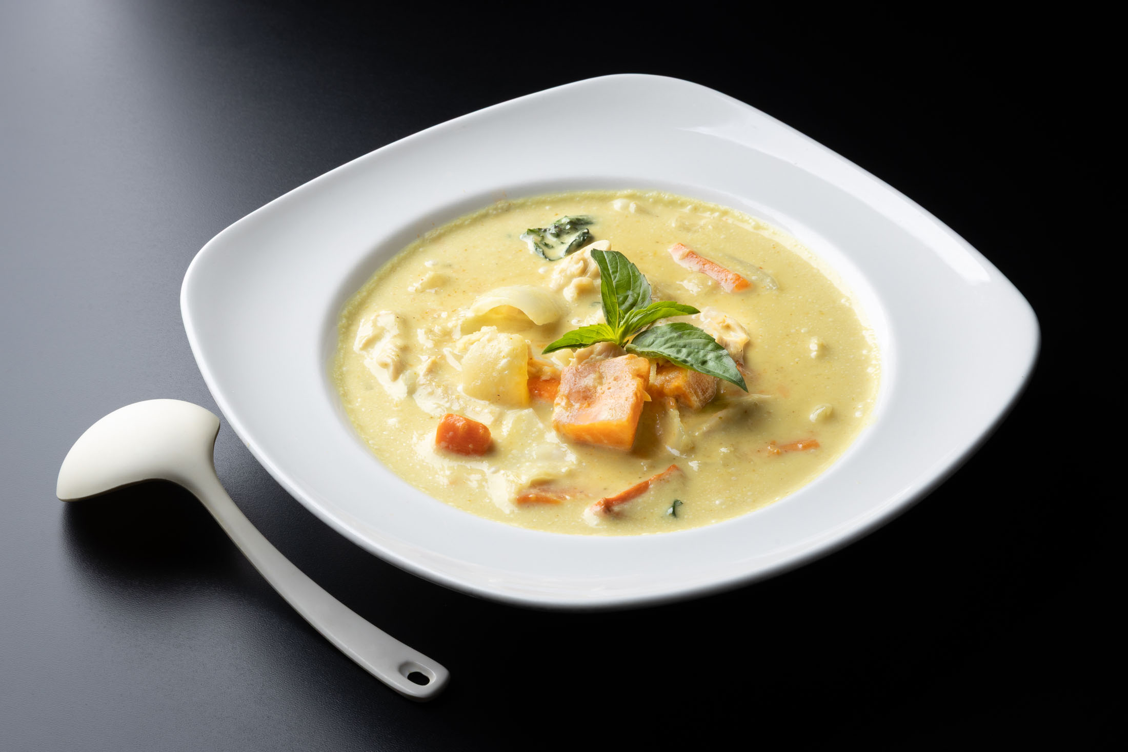 Mussels, scallops, calamari, white fish and prawns in a green curry and coconut cream sauce with bamboo shoots, bell peppers, snow peas, baby corn, cabbage, onions, carrots and fresh basil leaves.