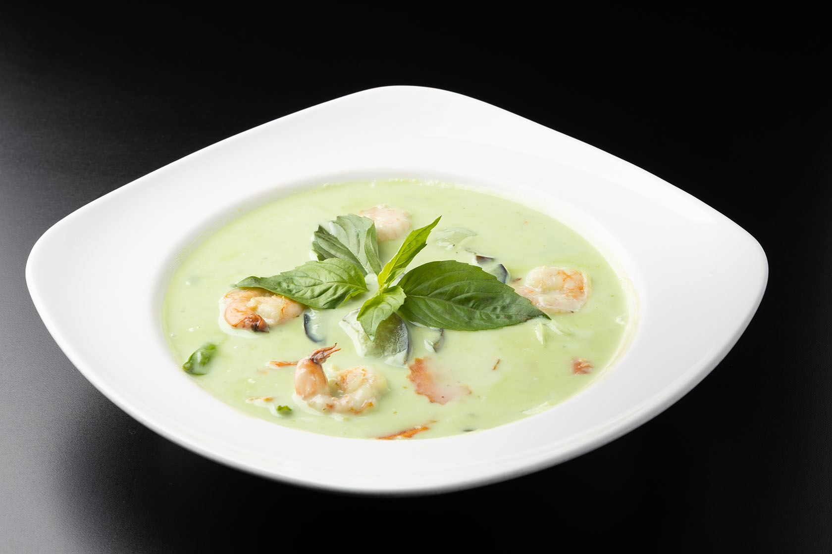 Tender strips of chicken breast, pork, beef, prawns, scallops or tofu, sautéed in garlic, lime leaves and lemongrass. Simmered in coconut milk and green curry paste with snow peas, onions, carrots, mushrooms and eggplant.