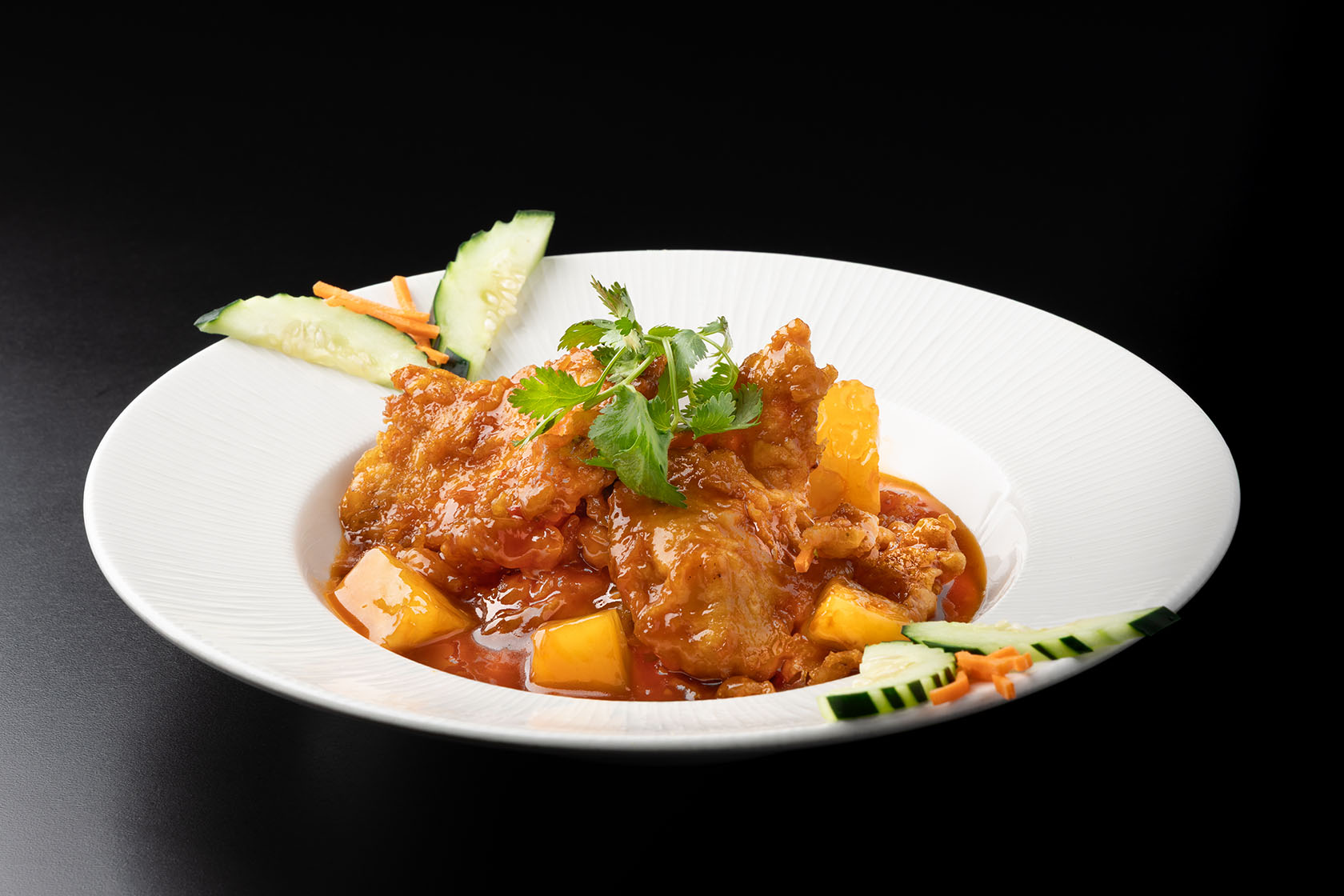 Crispy battered chicken breast slices cooked in a delicious honey garlic and sweet & sour orange sauce.