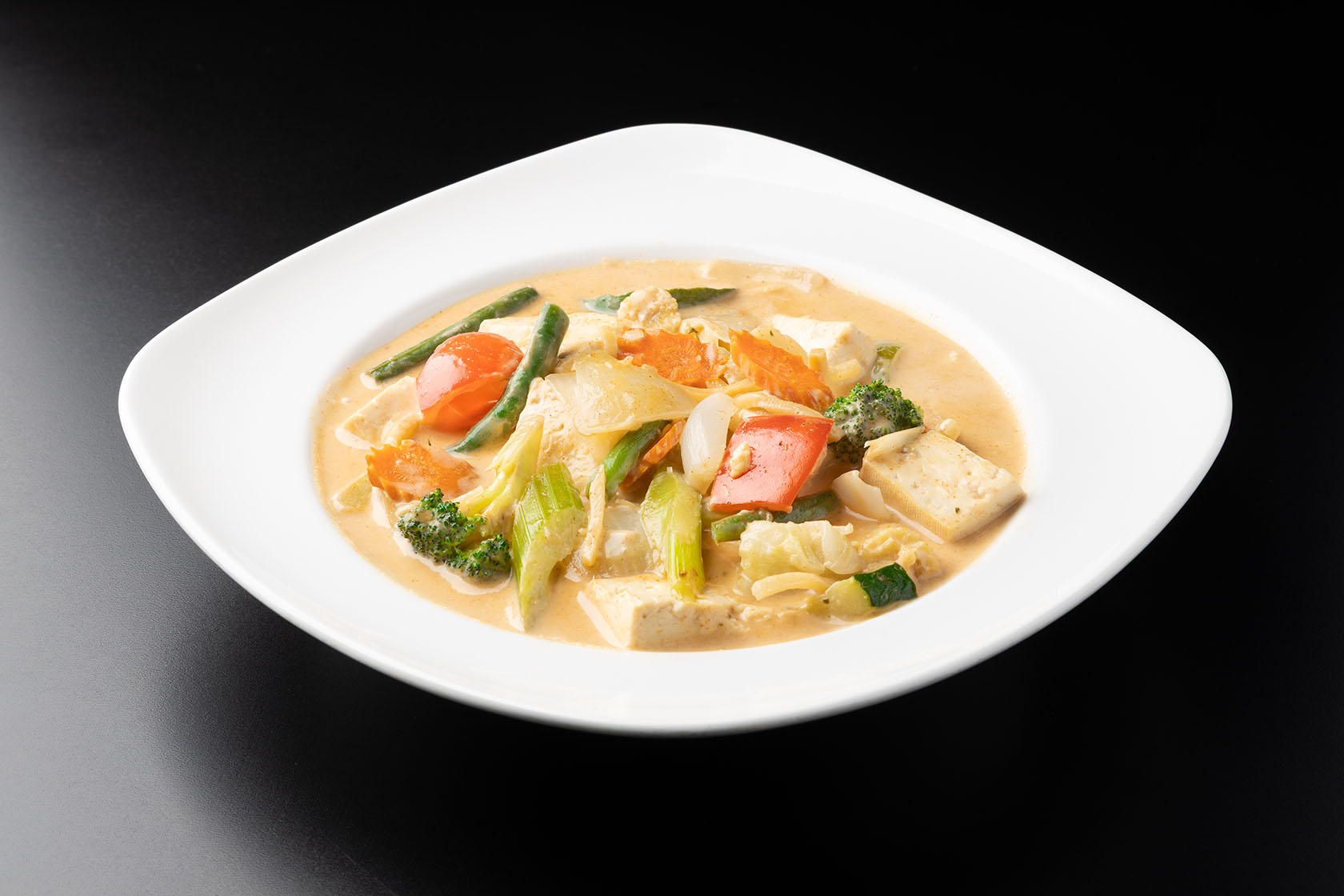 Tender strips of chicken breast, pork, beef, prawns, scallops or tofu in a yellow curry paste with coconut milk, onions, carrots, potatoes and yams.