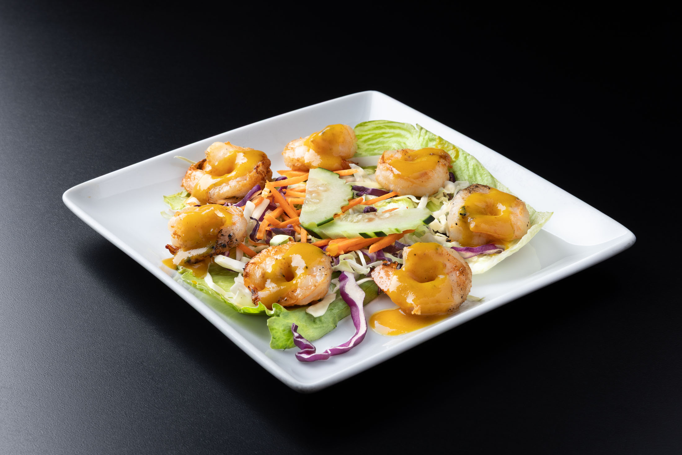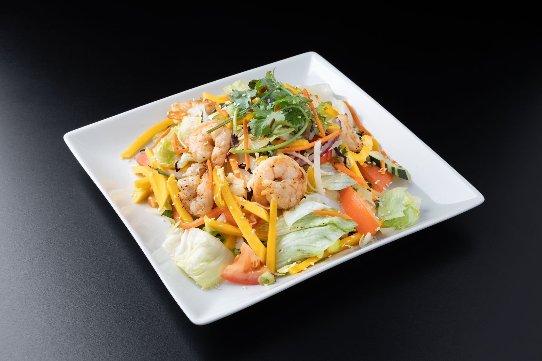 Grilled shrimp are tossed with lettuce, fresh mango, cucumber, bell peppers, onions, shredded cabbage, carrots and tomatoes. Topped with ground peanuts, sesame seeds, basil and green onions in a special dressing.