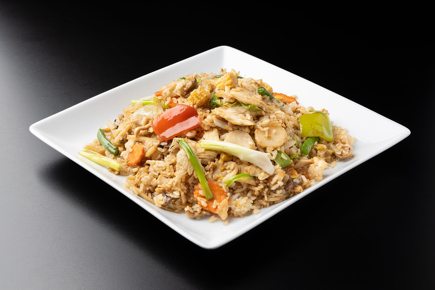 Fried rice with bell peppers, green beans, egg, bamboo shoots, baby corn, water chestnuts, mushrooms, bean sprouts, carrots and green onions. Your meat choice of chicken, pork, beef or tofu.