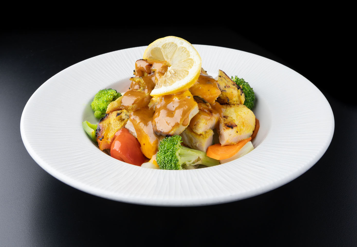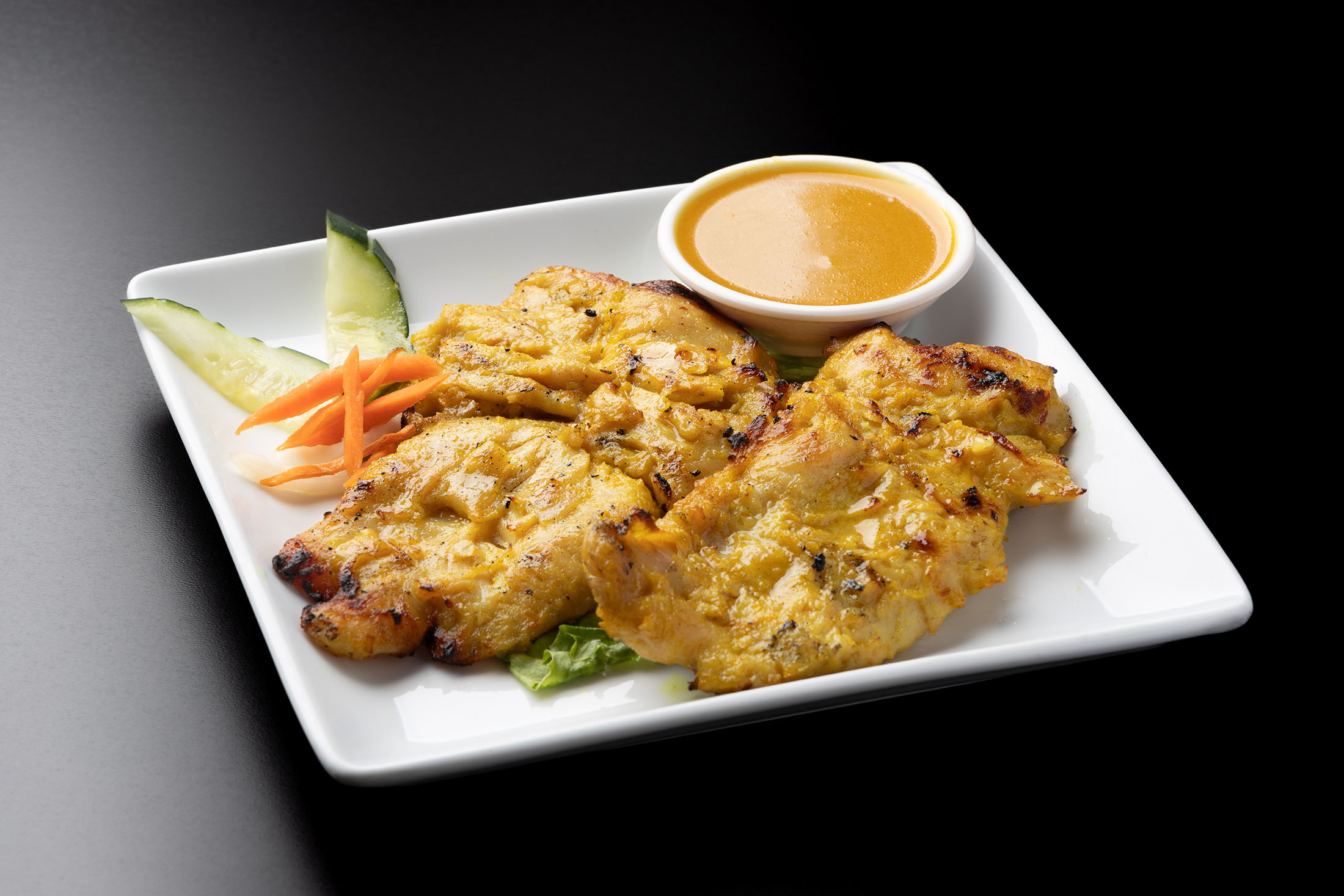Boneless free-range chicken, marinated in coconut milk, spices and herbs. Grilled and served over a bed of steamed vegetables with peanut sauce.