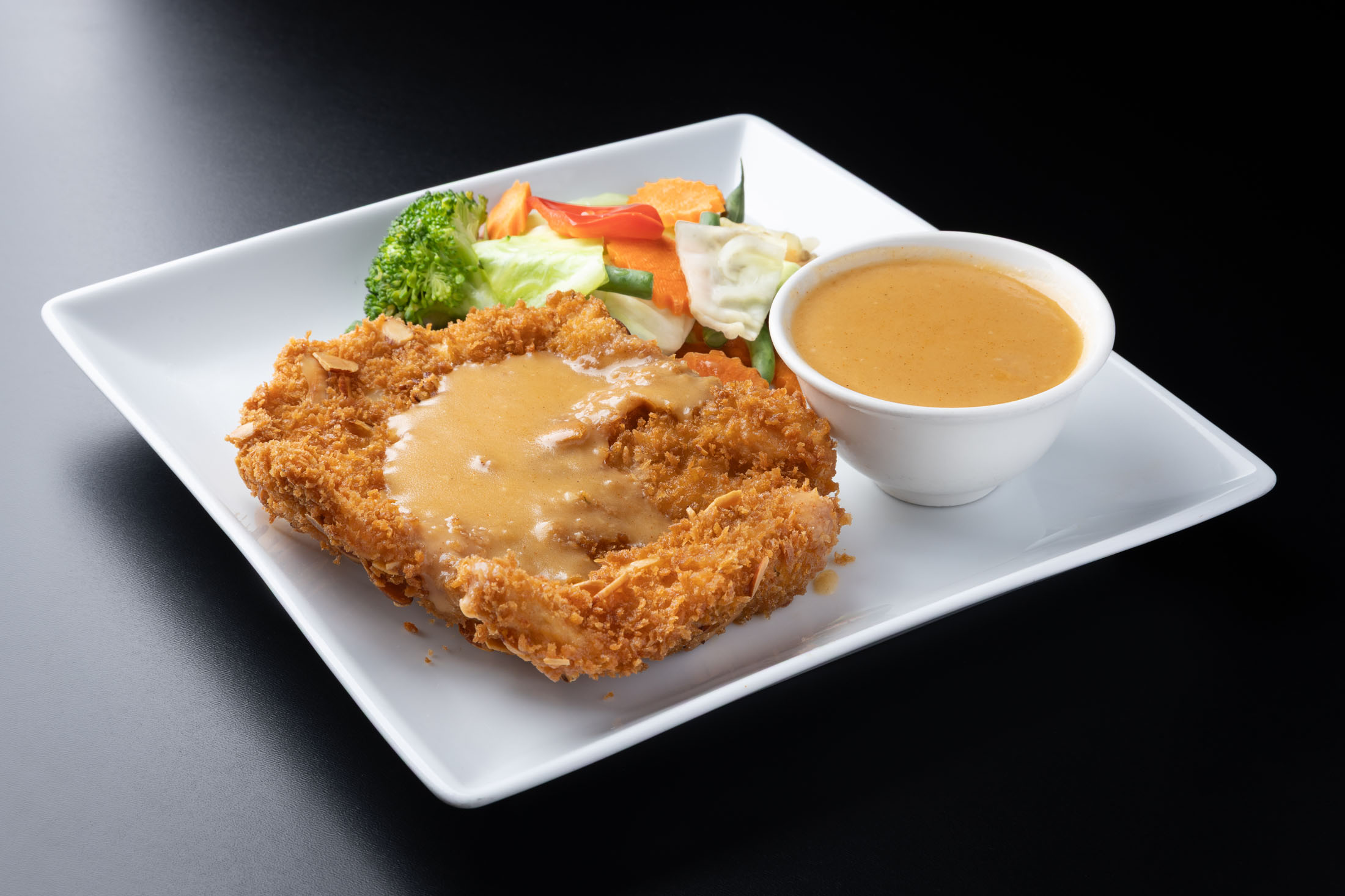 Tender cuts of fresh whole chicken breast breaded in a tasty panko almond batter and covered with our unique Asian style gravy. Served with fresh steamed vegetables.