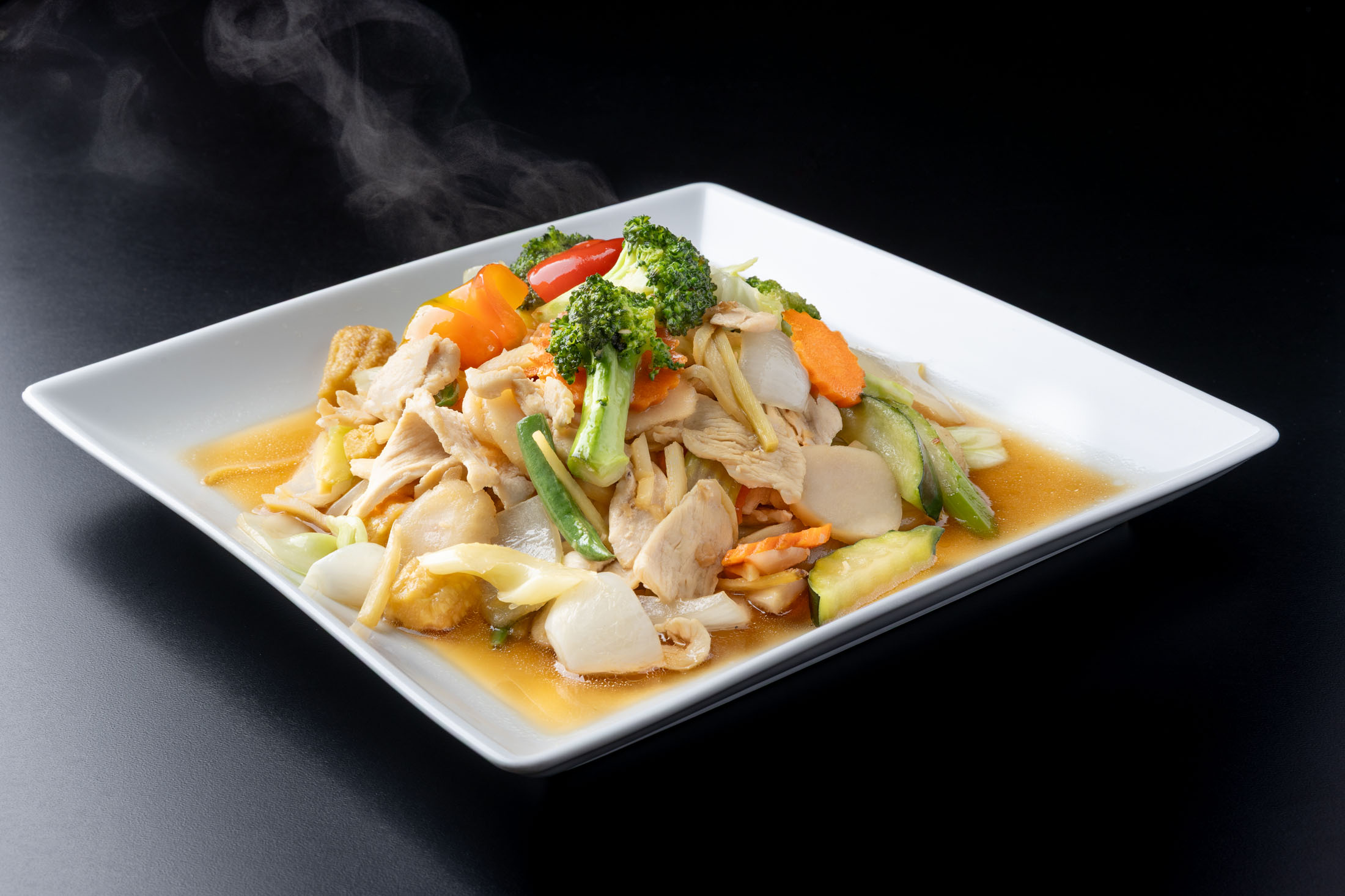 Stir-fried zucchini, red and green bell peppers, cabbage, baby corn, water chestnuts, bamboo shoots, carrots, onions and broccoli in a ginger seasoned sauce. Choice of chicken, pork, beef, prawns or tofu.