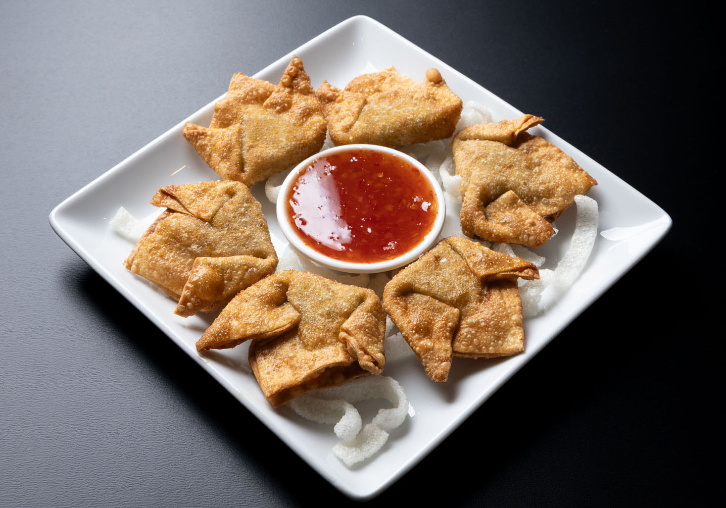 Wonton wraps filled with fresh crab, cream cheese and spices. Served with our sweet chili sauce.
