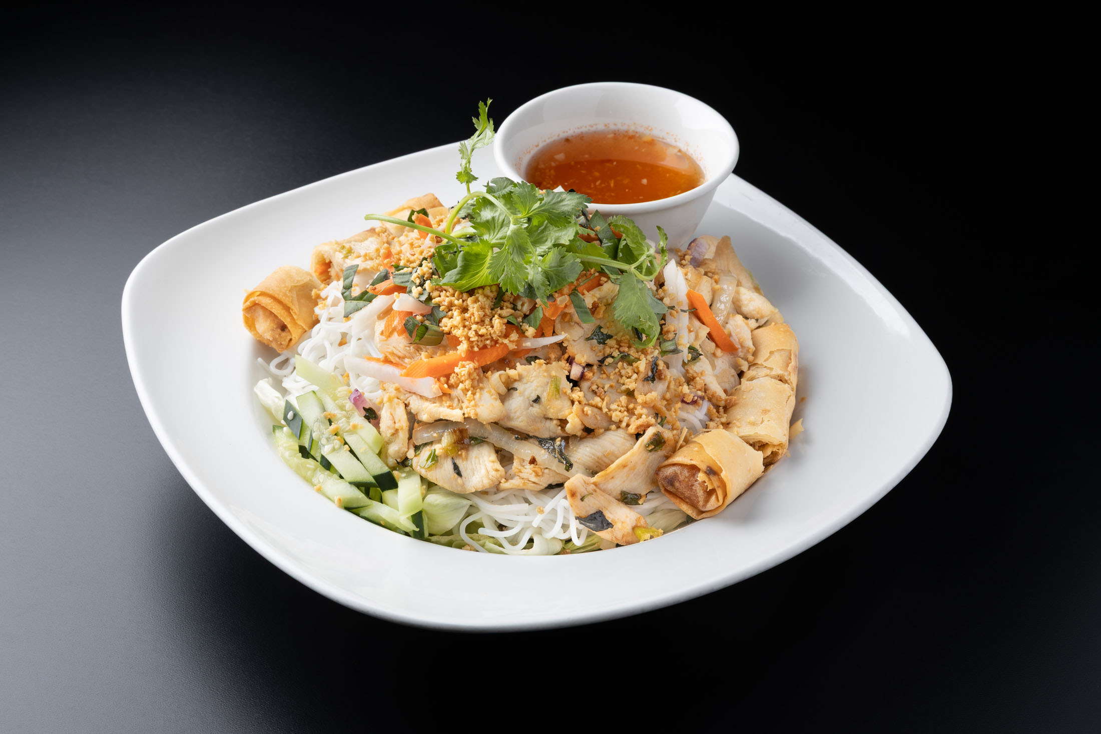Sautéed tender chicken strips or lightly fried tofu and egg rolls served with steamed rice noodles, lettuce, cucumber, shredded carrots and basil leaves. Topped with ground peanuts, scallions and garlic.