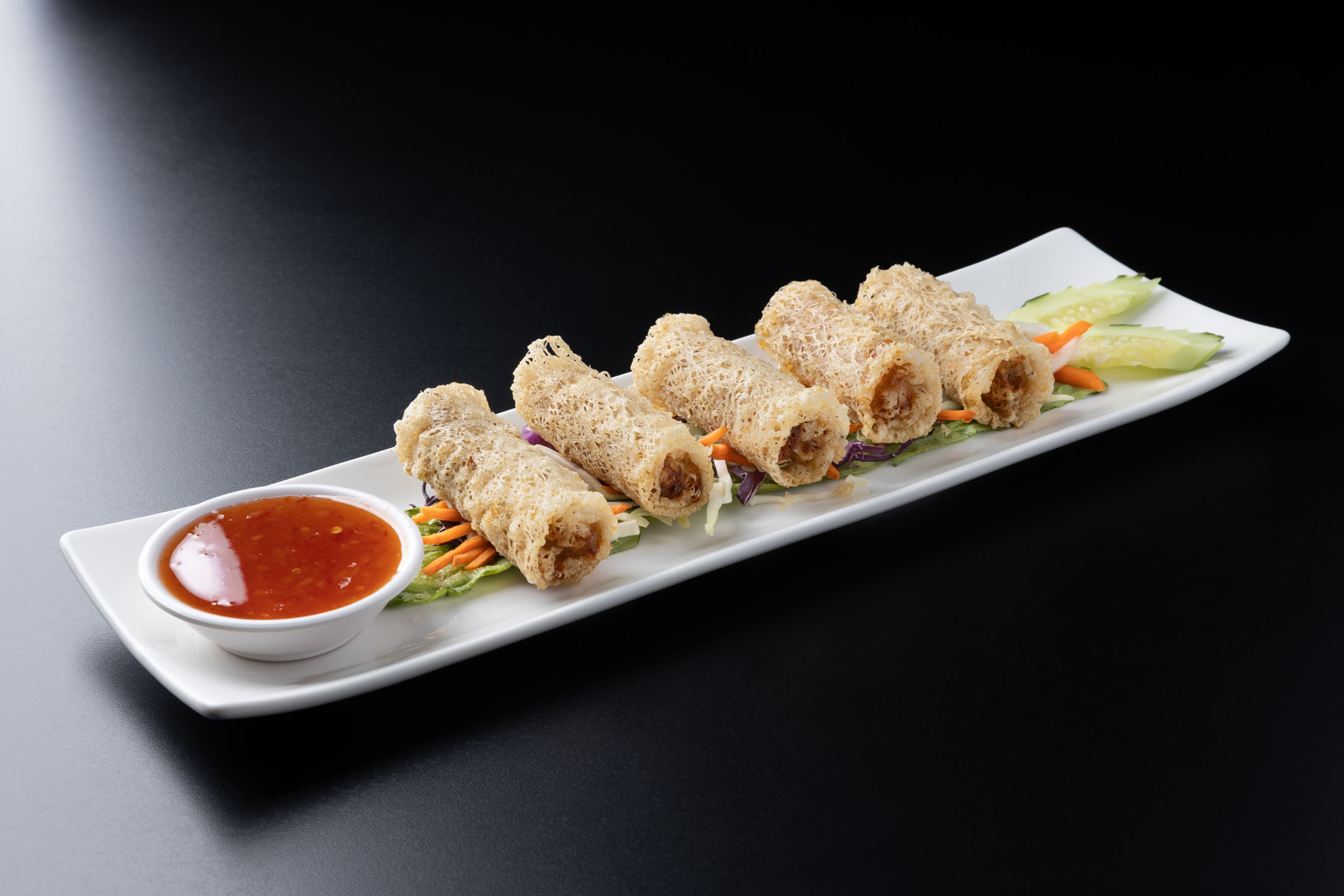 Four delicious crisp-fried spring rolls with a savory chicken or tofu filling. Served with our signature vinaigrette.